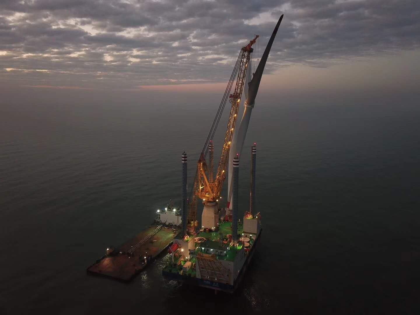 一航亨通海上風(fēng)電作業(yè)平臺總長120.5米,型寬38米,型深6.8米,是集“風(fēng)電基礎(chǔ)施工、風(fēng)電塔筒、塔架、機(jī)艙、輪轂、葉片”安裝與維護(hù)為一體的風(fēng)電作業(yè)平臺。該平臺艏部設(shè)有2600kW、艉部設(shè)有21300kW的全回轉(zhuǎn)舵槳,用于海上風(fēng)電場包括基座安裝、塔架、機(jī)艙以及葉片吊裝等施工作業(yè)。