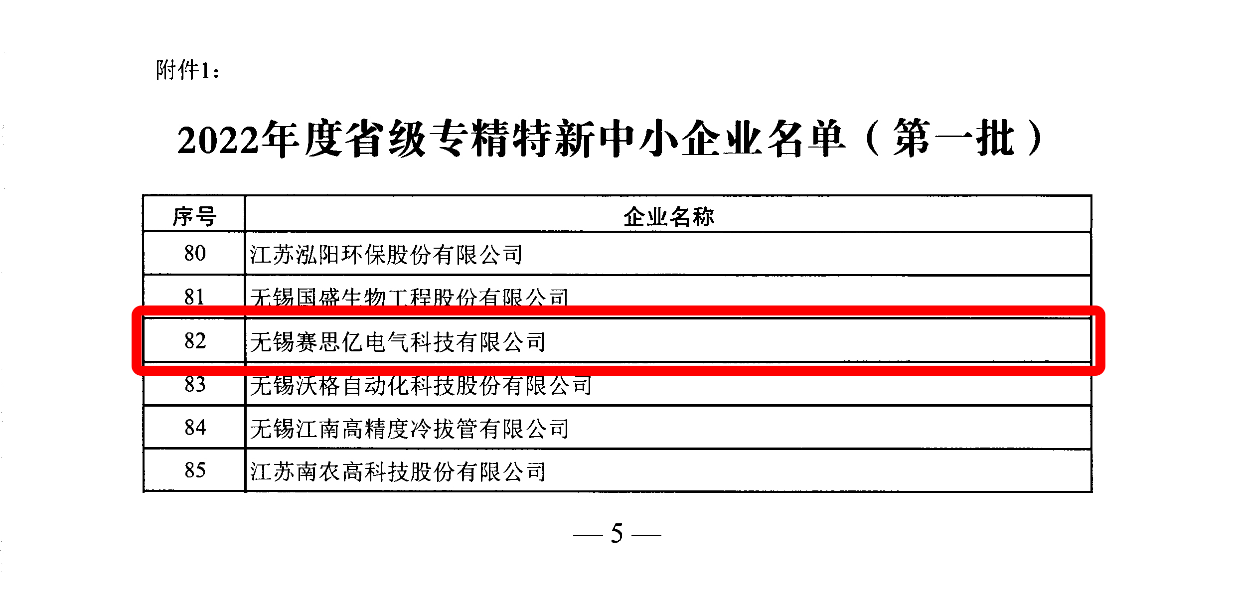 近日,江蘇省工業(yè)和信息化廳發(fā)布蘇工信中小【2022】651號(hào)《關(guān)于公布2022年度江蘇省專精特新中小企業(yè)名單(第一批)和復(fù)核通過企業(yè)名單的通知》,無錫賽思億電氣科技有限公司喜獲省專精特新中小企業(yè)認(rèn)定。