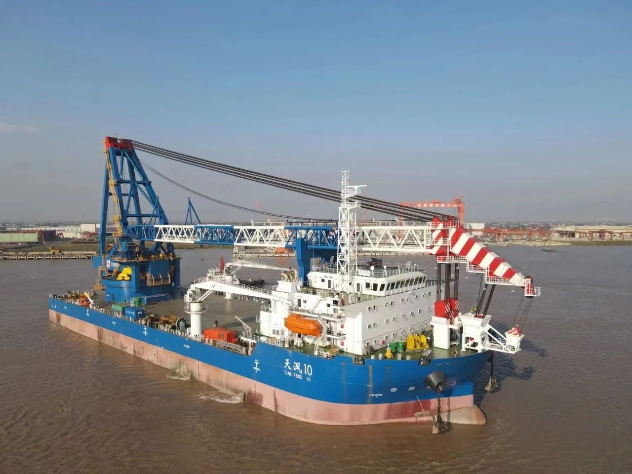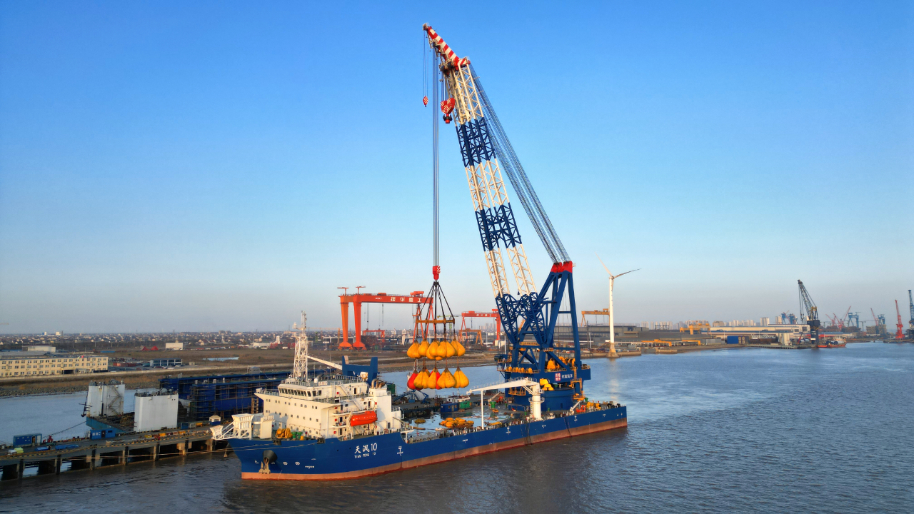 “天沨10”主要用于海上風(fēng)電單樁基礎(chǔ)、導(dǎo)管架、平臺(tái)模塊、升壓站組件以及大型海上鋼構(gòu)等吊裝工作。在固定尾吊狀態(tài)下,“天沨10”設(shè)備的最大起重量可達(dá)3000噸,最大起吊高度達(dá)110米,設(shè)備配備了起升、變幅及360°連續(xù)全回轉(zhuǎn)等操作功能,能夠全方位滿足海上風(fēng)電等工程施工的作業(yè)需求。